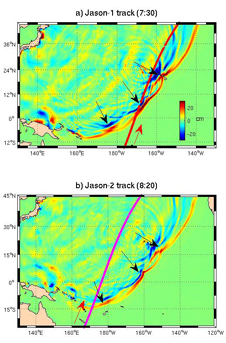The NASA-Centre National d'Etudes Spaciales Jason-1 satellite passed over the tsunami on March 11, as did two other satellites: the NASA-European Jason-2 and the European Space Agency's EnviSAT. All three satellites carry radar altimeters, which measure sea level changes to an accuracy of a few centimeters. Each satellite crossed the tsunami at a different location, measuring the wave fronts as they occurred. Jason-1 launched 10 years ago this week on Dec. 7, 2001.