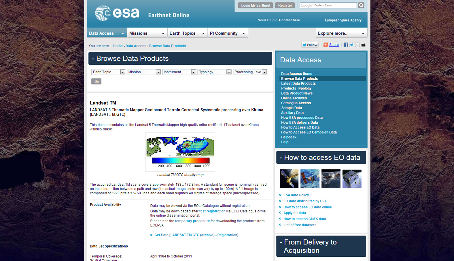 Data from the Enhanced Thematic Mapper on Landsat-7 and the Multispectral Scanner on the first five Landsat missions, dating back more than 40 years, will also be processed. These products will gradually become available over the course of 2014." In November 2011, ESA had opened its archive for the first time, allowing free access to over 30 years of archived Landsat data. ESA has been acquiring Landsat data at European stations since the 1970s.