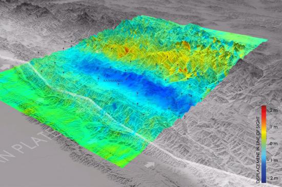 An image based on satellite data from the European Sentinel-1A satellite shows how and where the land uplifted and sank from the 7.8-magnitute earthquake that struck Nepal on 25 April 2015. Using satellite data generated before and after the earthquake, experts at the German Aerospace Center’s Earth Observation Center (EOC) created the image showing the different movements of the zones.