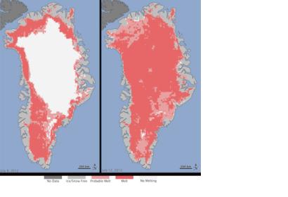 For several days this month, Greenland's surface ice cover melted over a larger area than at any time in more than 30 years of satellite observations. Nearly the entire ice cover of Greenland, from its thin, low-lying coastal edges to its two-mile-thick center, experienced some degree of melting at its surface, according to measurements from three independent satellites analyzed by NASA and university scientists.