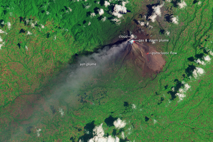 NASA's Landsat satellite has captured the ash plume and pyroclastic flow from the volcano on 6 March 2014. The false-color image clearly shows the pyroclastic flow in red on the eastern flank of Sinabung.