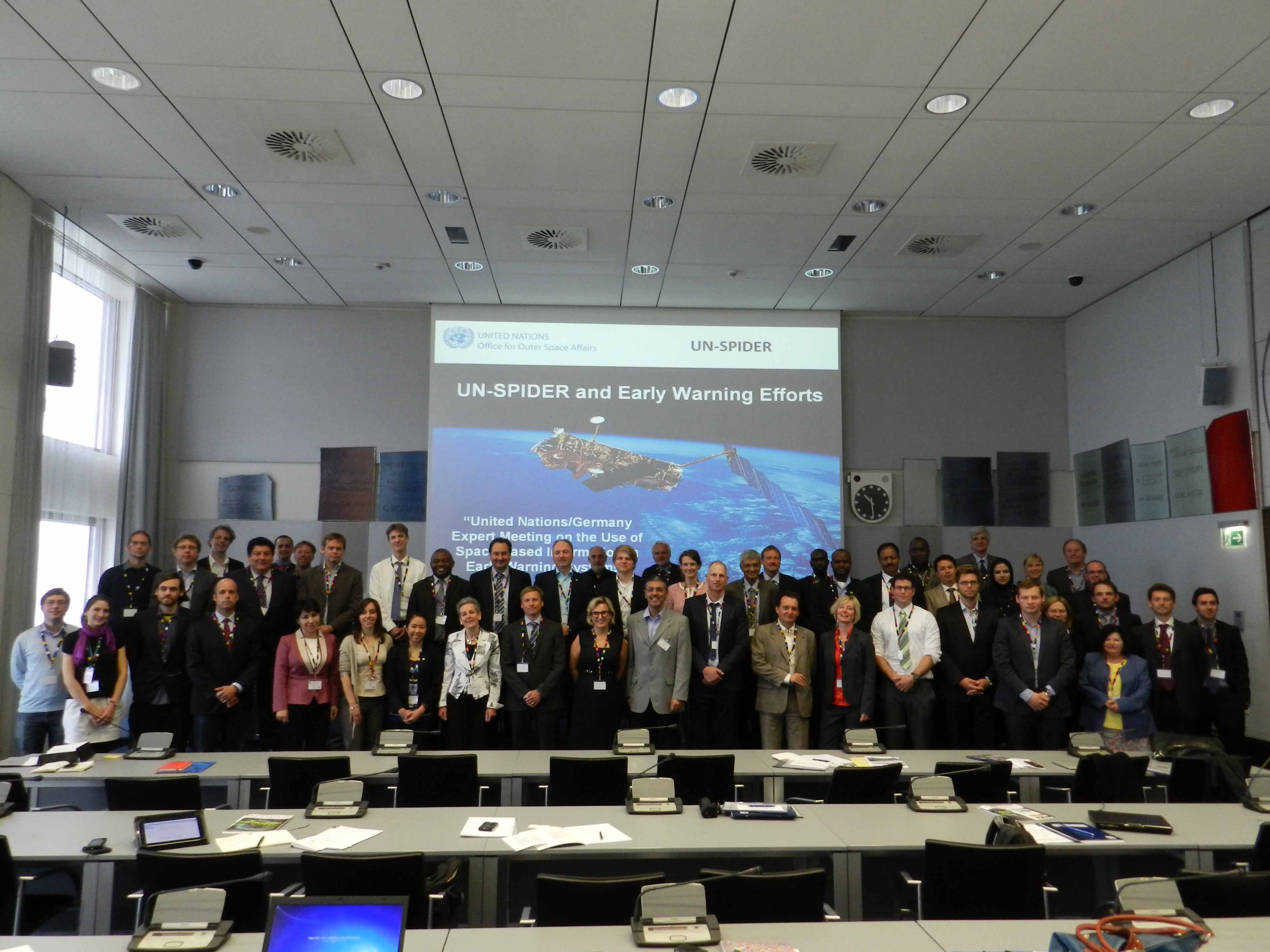 On 26 June 2013, the UN-SPIDER Programme wrapped up a two-day expert meeting focusing on space-based applications in Early Warning Systems. Taking into consideration the role of early warning systems in minimizing damages and losses in case of disasters, UN-SPIDER co-organized the meeting with the Government of Germany and the German Aerospace Center (DLR); with the support of Secure World Foundation (SWF) and the German Federal Office of Civil Protection and Disaster Assistance (BBK).  The Expert Meeting brought together fifty two space technology and disaster management experts representing national, regional and international organizations, internationally active private companies and included representatives of UN-SPIDER Regional Support Offices.