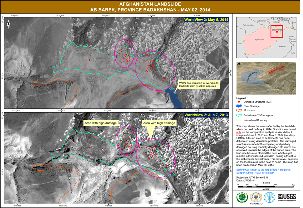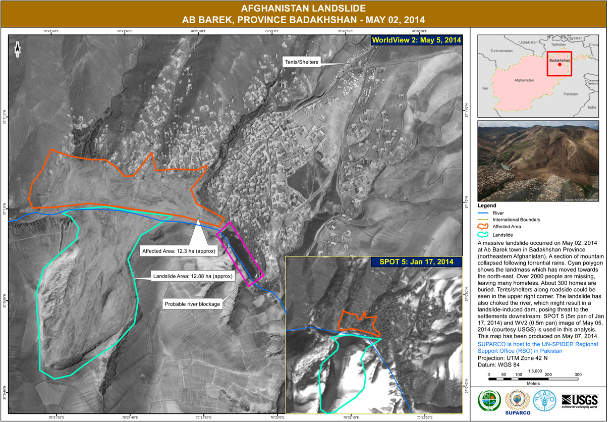 On 2 May 2014, torrential rainfall had caused a section of mountain to collapse burying about 300 homes with 2000 people missing. As UN-SPIDER reported previously, the International Charter: Space and Major Disasters was activated on 29 April 2014 in response to the heavy rains and flash floods in Afghanistan, which subsequently caused the landslide.