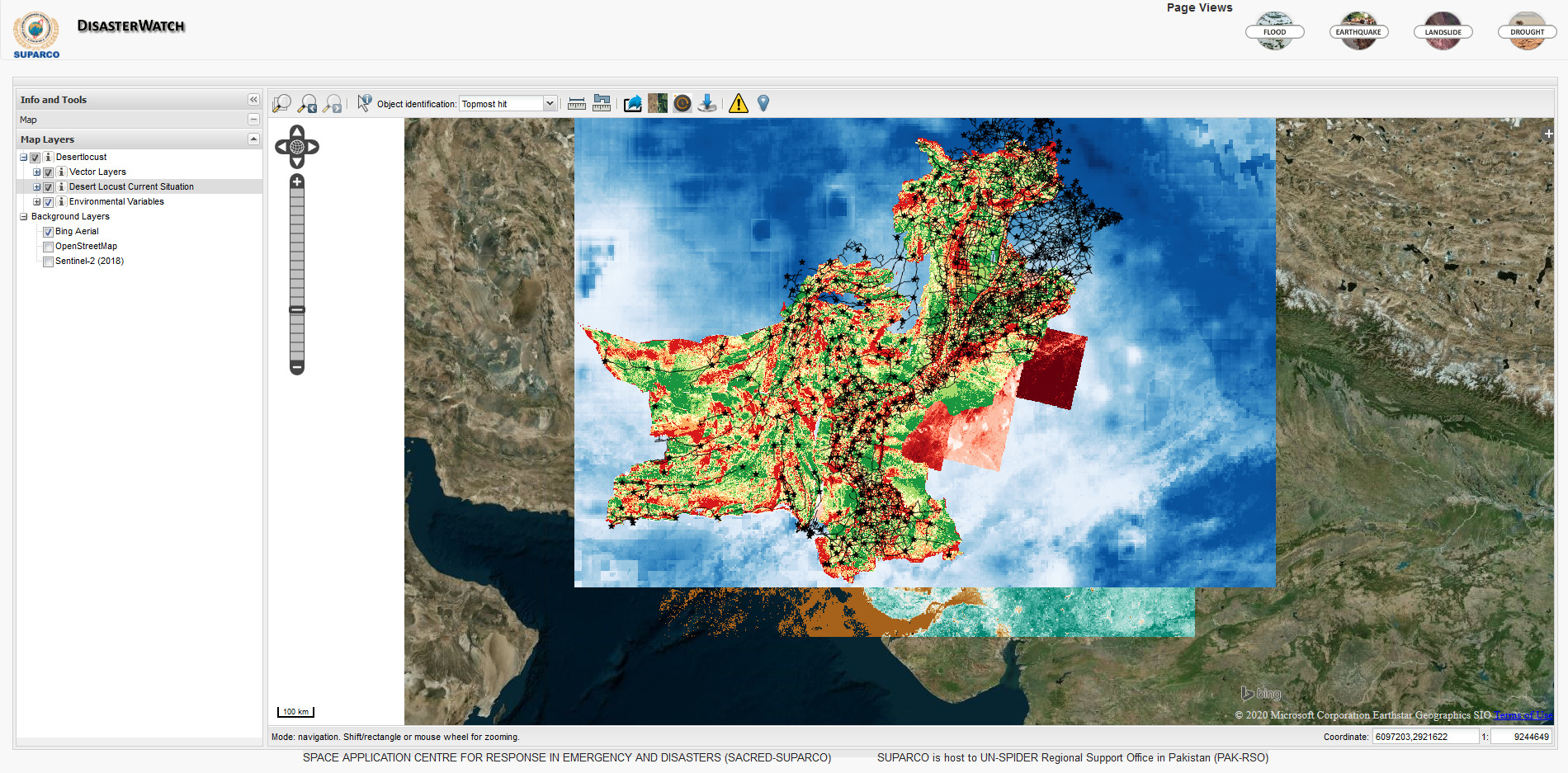 The Space Application Centre for Response in Emergency and Disasters (SACRED) of the Space & Upper Atmosphere Research Commission of Pakistan (SUPARCO), a UN-SPIDER Regional Support Office, is using space-based information to analyze areas with regards to their suitability as desert locust habitats based on vegetation, soil type and other factors. The results support surveillance and control operations by helping demarcate locust-prone areas.