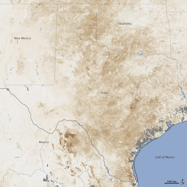 This image shows the impact of drought on plants throughout Texas, New Mexico, and Oklahoma. Made with data from the Moderate Resolution Imaging Spectroradiometer (MODIS) on the Terra satellite, the image compares plant growth between June 26 and July 11, 2011, with average conditions for the period. The image is dominated by brown, showing that plants were growing less than average throughout Texas and New Mexico.