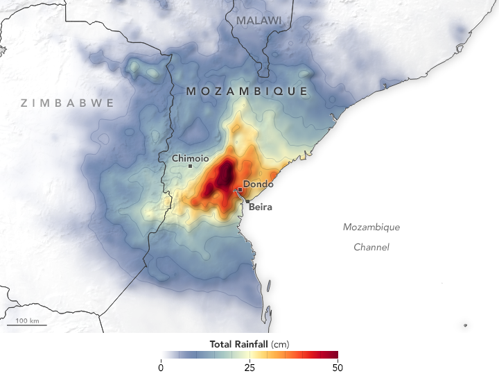 The map shows rainfall accumulation from March 13 to March 20, 2019. Many areas received as much as 50 centimeters of rain. These data are remotely-sensed estimates that come from the Integrated Multi-Satellite Retrievals (IMERG), a product of the NASA Global Precipitation Measurement (GPM) mission. Local rainfall amounts can be significantly higher when measured from the ground.