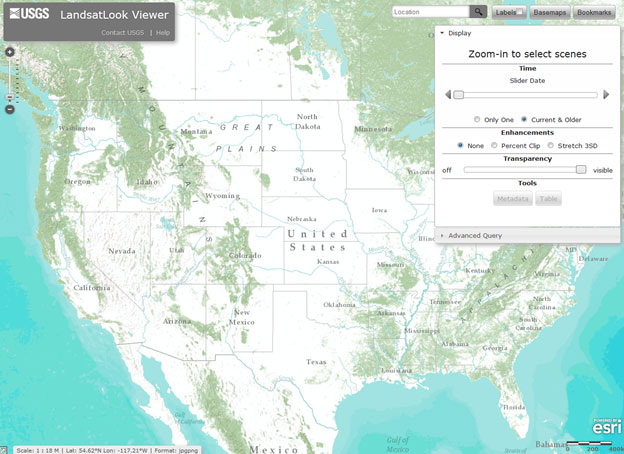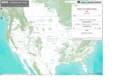 On 23 July 2012 the United States Geological Survey (USGS) made available their new LandsatLook Viewer. It allows comprehensive searching and downloading of full-resolution LandsatLook images, along with access to Level 1 Data Products. Users can find their area of interest by the text-based search tool in the upper right or by panning and zooming around the globe. The Select Scene button will activate when zooming in to a 1:1M resolution or closer. The default scene search uses TM and ETM+ imagery from 1999 to present at 20% cloud cover. Using the tools in the Advanced Query section, users can modify the default parameters: years of coverage, cloud cover ranges, and sensor selection.