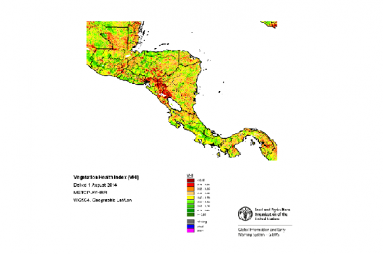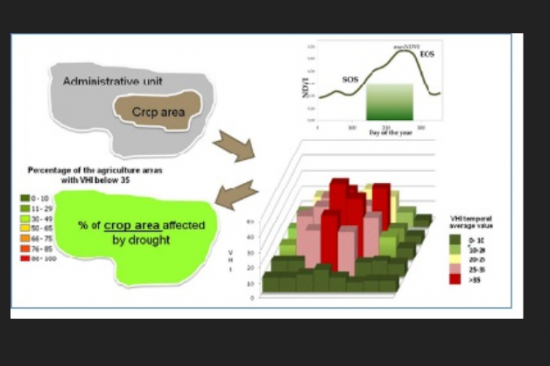 ASIS is based on the Vegetation Health Index (VHI), derived from NDVI and developed by Kogan (1994, 1995 and 1997). This index was successfully applied in many different environmental conditions around the globe, including Asia, Africa, Europe, North America and South America. VHI can detect drought conditions at any time of the year. For agriculture, however, we are only interested in the period most sensitive for crop growth (temporal integration), so the analysis is performed only between the start (SOS) and end (EOS) of the crop season and restricted to crop areas. ASIS assess the severity (intensity, duration and spatial extent) of the agricultural drought and express the final results at the administrative level given the possibility to compare it with the agricultural statistics of the country.