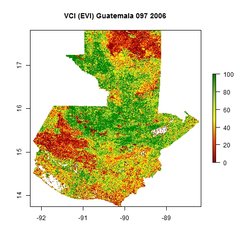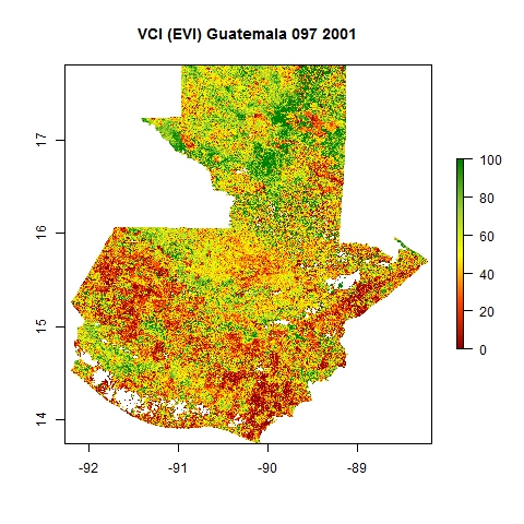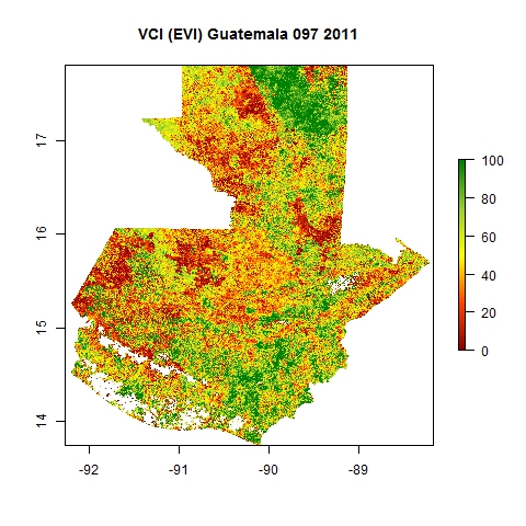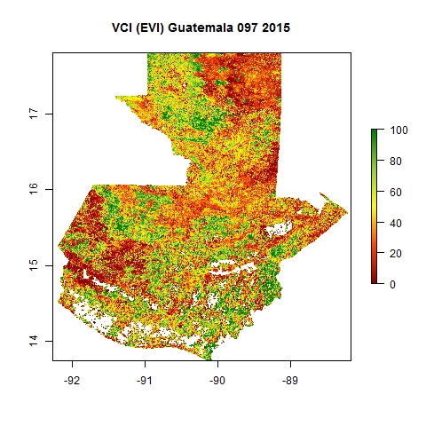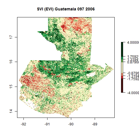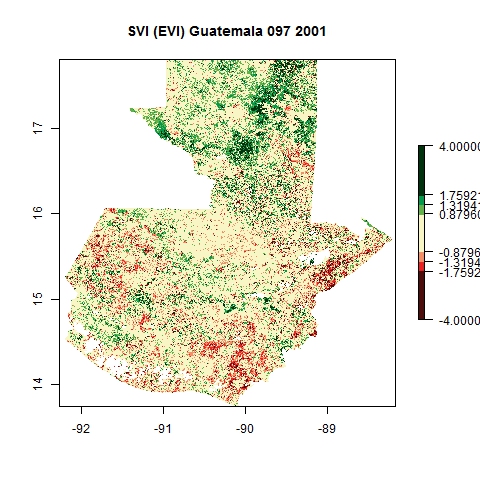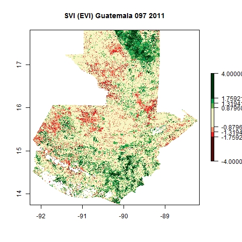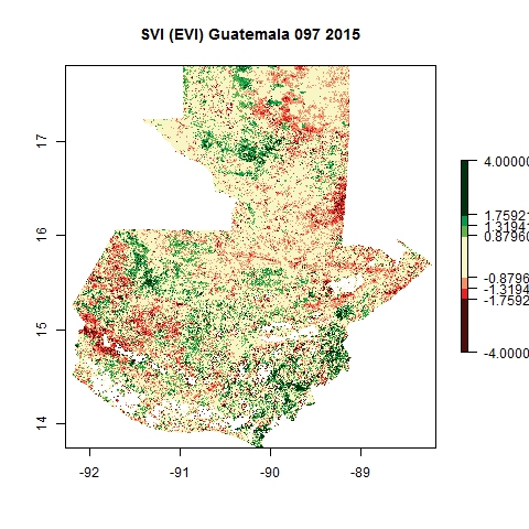 Comparison of SVI and VCI maps for Guatemala for Julian day 97 corresponding to four distinct years using EVI composite products from MODIS.