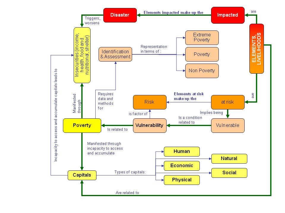 Based on the hypothesis that the GEC negatively affected livelihoods, increased poverty conditions and subsequently increased vulnerability to natural disasters; an ontology was developed to link these parameters and to model how the GEC could impact them. The ontology proposes that elements such as livelihoods may be at risk when they are vulnerable and exposed to a hazard. Other elements at risk may include infrastructure, processes, services, communities, etc. A disaster is triggered by a hazard such as an earthquake, a flood, or a tsunami and is represented through the impacts which are characterized in terms of damages and losses.