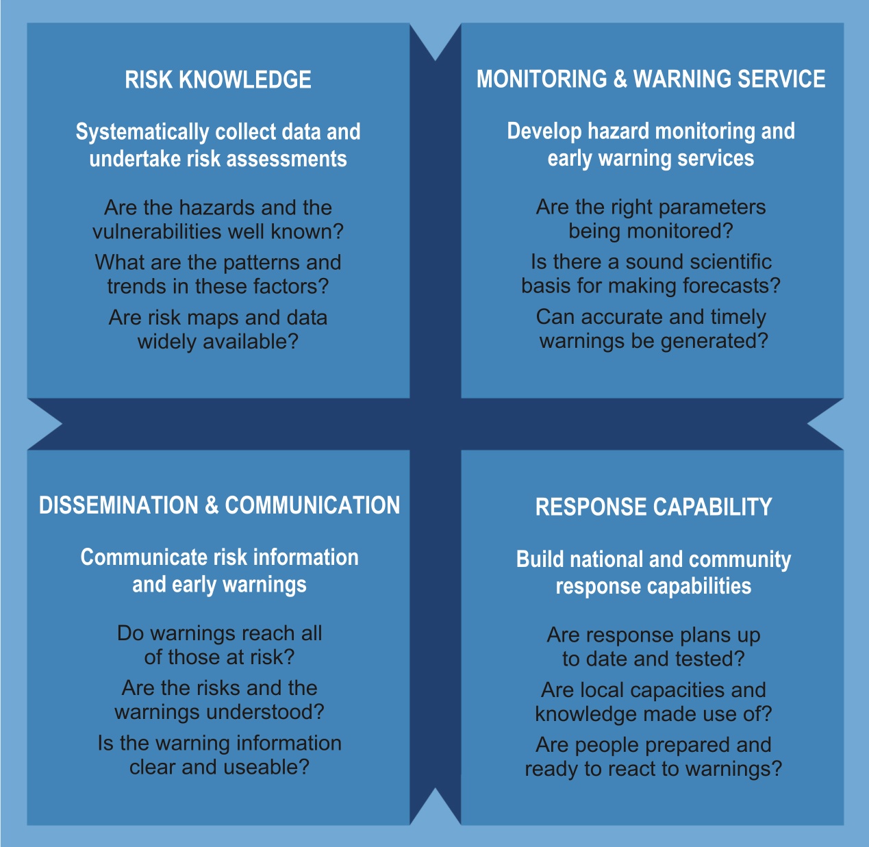 In 2003, experts taking part in the 2nd International Early Warning Conference introduced the current concept of efficient or people-centred early warning systems based on four elements: