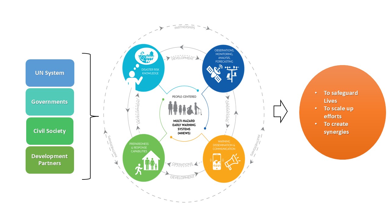 The Early Warnings for All initiative unites the broader UN system, governments, civil society, and development partners from both the public and private sectors under the umbrella of the World Meteorological Organization to strengthen collaboration and accelerate efforts to close gaps in delivering comprehensive, people-centered, multi-hazard early warning systems. The initiative seeks to scale up efforts and create synergies among initiatives and partnerships across various sectors. Its goal is to safeguard lives and livelihoods from natural hazards, including floods, heat waves, storms, and tsunamis.